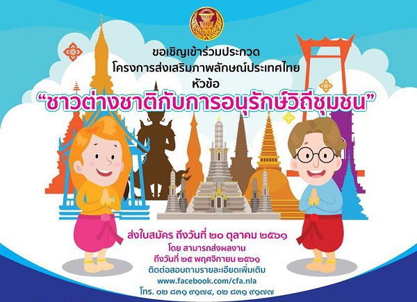 คณะอนุกรรมาธิการศึกษาและติดตามการส่งเสริมภาพลักษณ์และการคุ้มครองผลประโยชน์ไทยในต่างประเทศ ในคณะกรรมาธิการการต่างประเทศ สภานิติบัญญัติแห่งชาติ ขอเชิญ นักเรียน นิสิต นักศึกษา ส่งผลงานเข้าประกวดสื่อประชาสัมพันธ์ “ชาวต่างชาติกับการอนุรักษ์วิถีชุมชน” ประจำปี 2561 ชิงเงินรางวัลมูลค่ารวมกว่า 400,000 บาท พร้อมโล่เกียรติยศจากประธานสภานิติบัญญัติแห่งชาติ